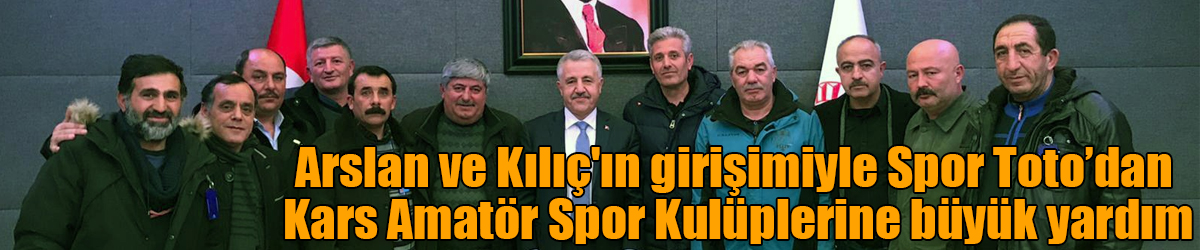 Kars Milletvekilleri 65. Hükümet Ulaştırma, Denizcilik ve Haberleşme Bakanı Ahmet Arslan ile TBMM Tarım, Orman ve Köyişleri Komisyon Başkanı Prof.Dr. Yunus Kılıç’ın girişimleriyle Kars’taki 12 amatör spor kulübüne Spor Toto’dan yardım yapıldı.