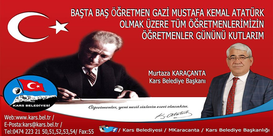 Gazi Mustafa Kemal Atatürk’ün 24 Kasım 1928 yılında ‘başöğretmen’ sıfatını alması vesilesiyle, 1981 yılından bu yana her yıl kutlanan öğretmenler günü nedeniyle Kars Belediye Başkanı Murtaza Karaçanta, kutlama mesajı yayınladı.