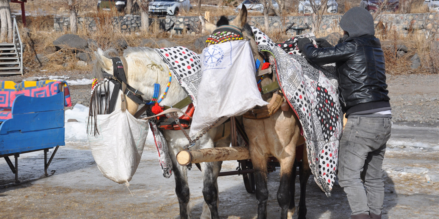 Soğuk havadan atları korumak için üzerlerini örttüklerini ifade eden İbrahim Ada, "Atların üzerine üşümesinler diye battaniyeleri atıyoruz. Burada yerli yabancı turistleri kızak keyfine davet ediyoruz. Herkesi burada gezdiriyoruz. Sobada ısınıyoruz, atlarımızla güzel keyifler yaşıyoruz" dedi.