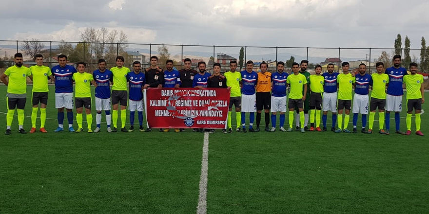 Kars’ta yapılan Kars Demirspor ile Selim Gençlikspor futbol maçında oyuncular Mehmetçiğe pankart açarak destek verdi.