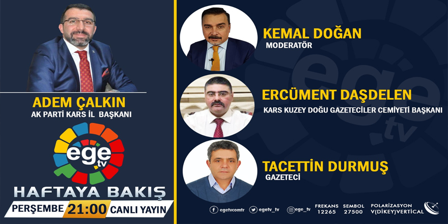 AK Parti Kars İl Başkanı Adem Çalkın, Ege TV’de Kemal Doğan’ın hazırlayıp sunduğu “Haftaya Bakış” adlı programda gazetecilerin sorularını cevaplandıracak.