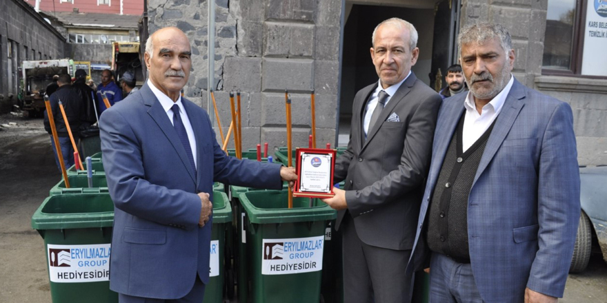 75 adet çöp toplama konteyneri, 75 adet faraj ve 75 adet süpürge desteği veren ilgili firmaya Kars Belediyesi Temizlik İşlerinden Sorumlu Başkan Yardımcısı Ferit Yenice ve Temizlik işleri Müdürü Kemal Özyılmaz, yapmış olduğu bu anlamlı destekten dolayı firma sahibine plaket vererek teşekkür etti.