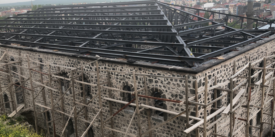 Kars'ta, 1579 yılına Lala Mustafa Paşa tarafından inşa edilen Beylerbeyi Sarayı'nın restorasyonu sürüyor. Tamamlandığı Butik Otel olması planlanan sarayının çatısının çelik profilleri yerleştiriliyor.