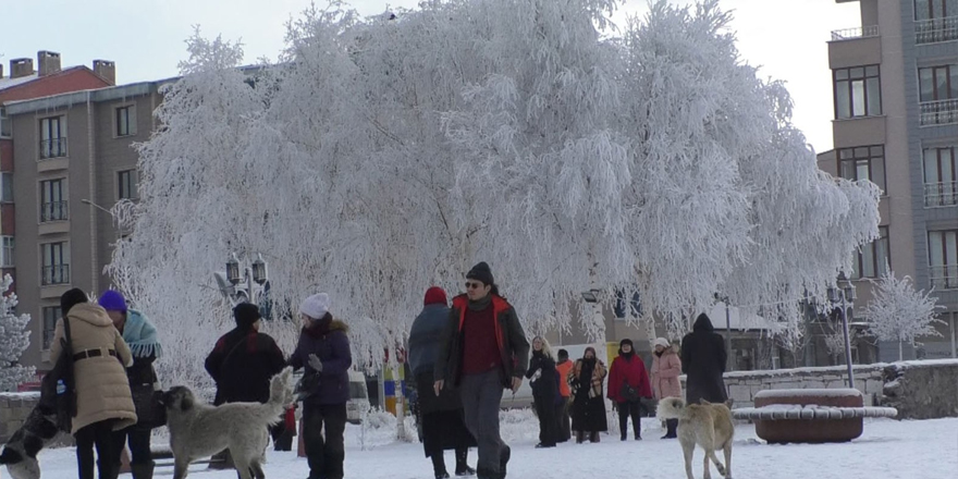 Kars'a turla gezmeye gelen vatandaşlar ise kırağı tutmuş ağaçların önünde fotoğraf çekildi.
