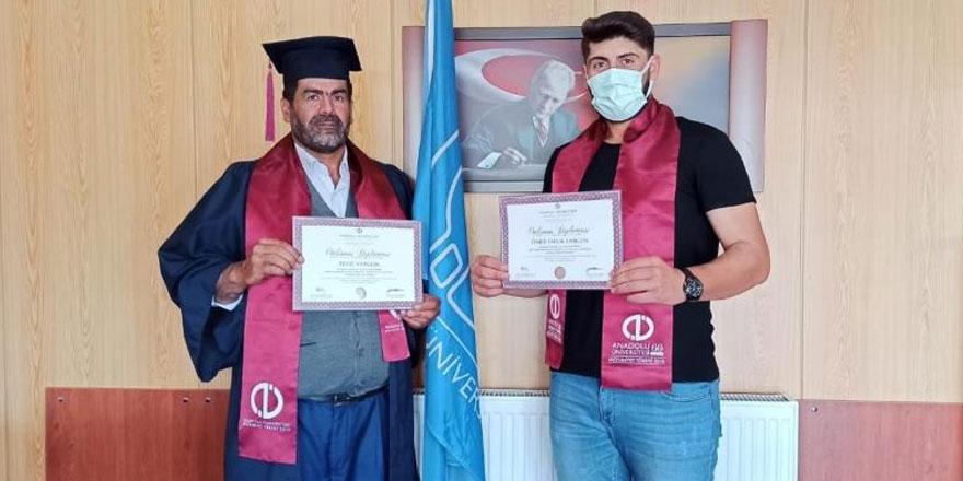 Anadolu Üniversitesi Açıköğretim Fakültesi'nde okuyan baba Fevzi Vargün ile oğlu Ömer Faruk Vargün, birlikte mezun olmanın mutluluğunu yaşadılar.