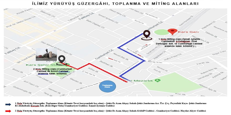 2. Güzergah: Toplanma yeri olan Kömür Tevzii karşısındaki boş alandan Şehit Er Asım Akçay Sokak, GAMP Caddesi, Cumhuriyet Caddesi, Haydar ALİYEV Caddesi (Eski Ordu Caddesi), Kars Şehir Stadyumunun arka tarafına kadar olan güzergah 2 no.lu gösteri yürüyüşü güzergahıdır.