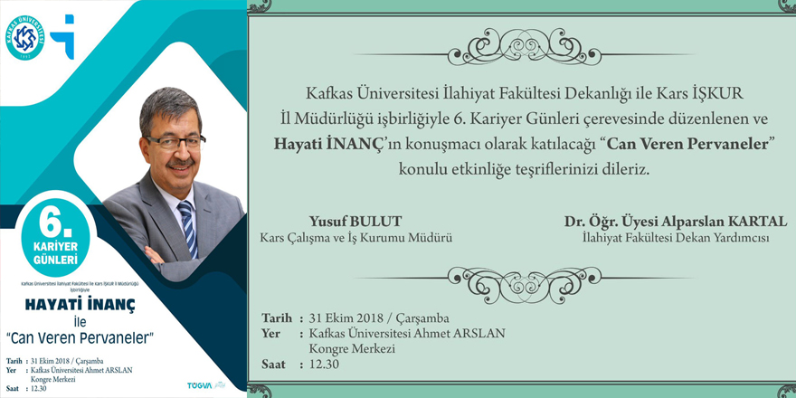 Düzenlenen 6. Kariyer Günlerine Hayati İnanç konuşmacı olarak katılarak “Can Veren Pervaneler” konulu konuşma yapacak.
