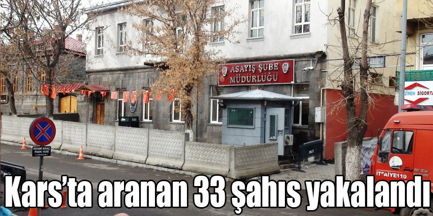 Kars İl Emniyet Müdürlüğü, Asayiş Şube Müdürlüğü görevlileri tarafından 27 Nisan 2018 ile 13 Mayıs 2018 tarihleri arasında çeşitli suçlardan aranan şahısların yakalanmasına yönelik olarak yapılan çalışmalar neticesinde toplam 33 şahısın yakalandığı bildirildi.