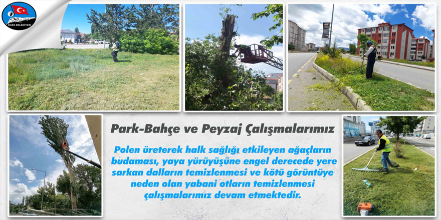 Kars Belediye Başkanlığından çalışmalar ile ilgili olarak yapılan açıklamada; “Çalışmalar kapsamında; polen üreterek halk sağlığını etkileyen ağaçların budaması yapıldığı gibi; yaya yürüyüşüne engel olan yere sarkan dallar da temizleniyor ve kötü görüntüye neden olan yabani otlar da temizleniyor. Daha yeşil ve estetik bir Kars için Park ve Bahçeler Müdürlüğümüzce yeşil alanlar, refüjler ve parklarda ağaç dikimi, ağaç bakımı, budama, çim biçme, yabani ot temizliği, bordür boyama, oyun parkı bakım, kamelya tamiri gibi çevre düzenlemeleri devam edecektir.” denildi.