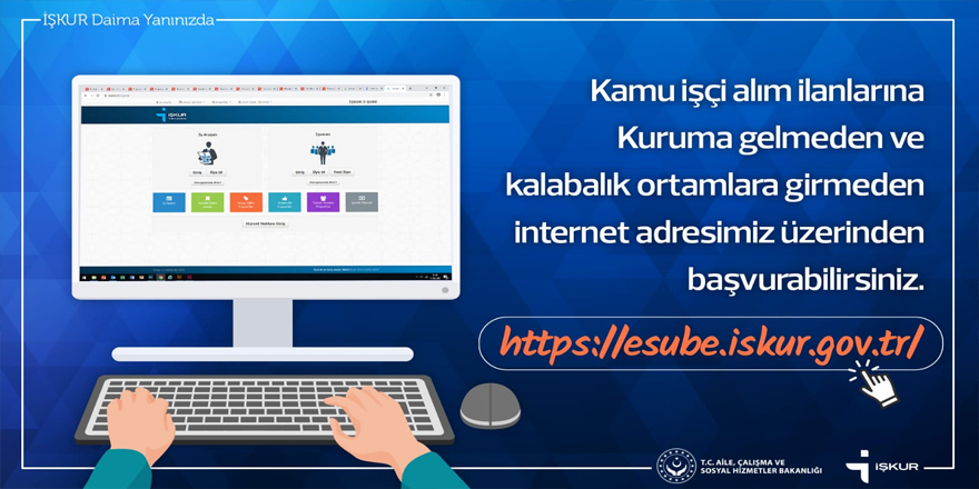 Vatandaşlar, İŞKUR İl Müdürlüğü hizmet binasına gitmeden İŞKUR hizmetlerine ulaşabilmeleri için E-Devlette bulunan uygulamalar ile web sitesi üzerinden online olarak ya da Bakanlık iletişim merkezi (ALO 170) ile iletişime geçerek işlemlerini yapabilecek ve kurumsal sosyal medya hesaplarını takip ederek bilgi sahibi olabilecekler.