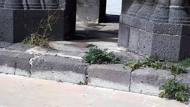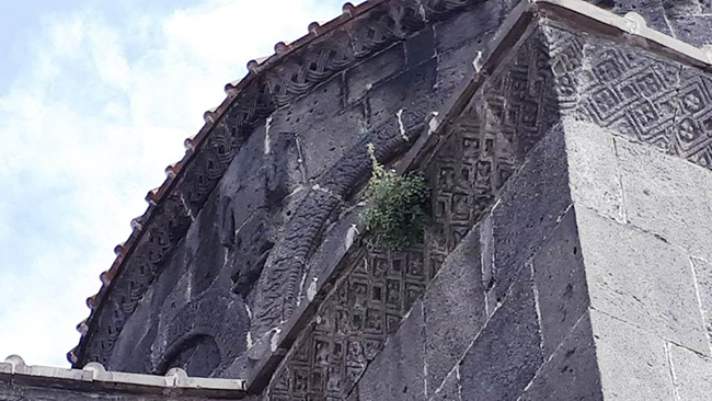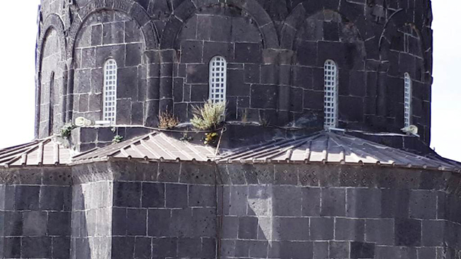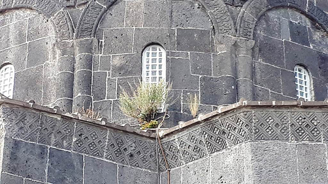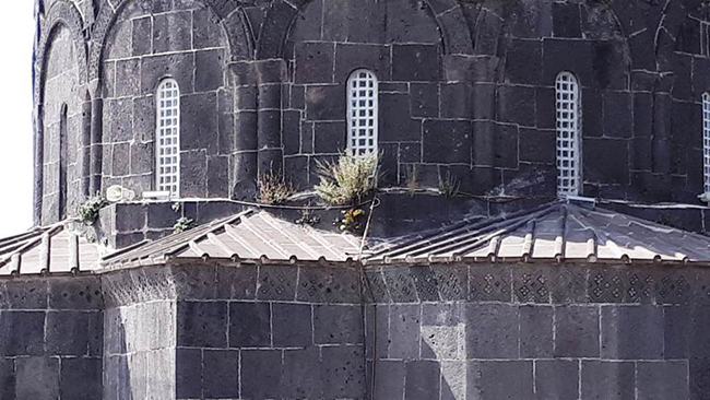 Kars Kalesi eteklerinde, Ebul Hasan Harakani’nin sandukasının da içerisinde bulunduğu Evliya Camii, taş köprü, hamamlar ile birlikte şehrin en önemli tarihi varlıklarından biri olan 1080 yaşındaki kilisenin duvarlarında çıkan otlar ziyaretçileri üzüyor.
