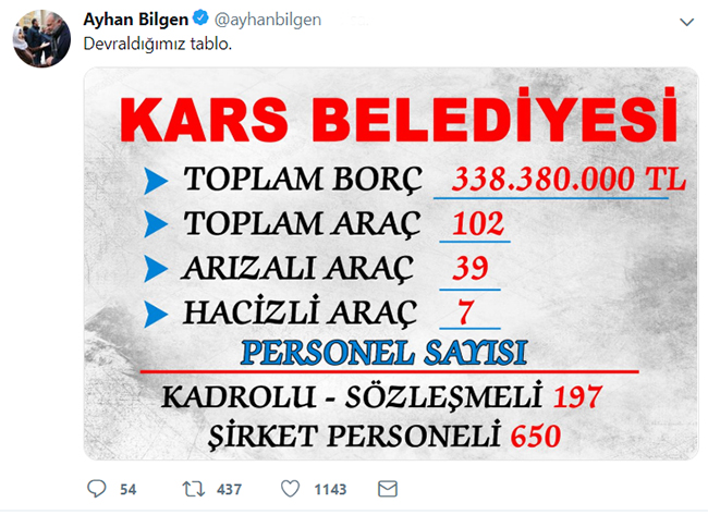 Başkan Bilgen sosyal medya hesabından Kars halkına duyuru yaparak, Kars Belediyesini güncel borcunun 338.380.000 TL olduğunu duyurdu.