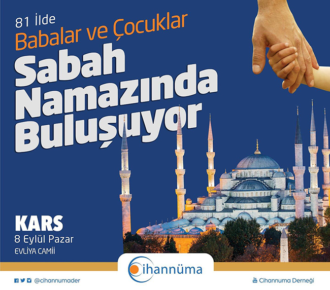 Cihannüma Derneği “81 ilde Babalar ve Çocuklar Sabah Namazında Buluşuyor” etkinliği düzenleyecek. Cihannüma Dayanışma ve İşbirliği Derneği Resmi twitter hesabından yapılan, “8 Eylül Pazar 81 İlde Babalar ve Çocuklar Sabah Namazında Buluşuyor. Kuşaklar arasındaki bağ güçlensin. Büyükler örnek alınsın, küçüklere örnek olunsun. Tut çocuğunun elinden, tut babanın elinden gel. Bu güzellik kaçmaz.” Duyurusu birçok Karslı vatandaş tarafından paylaşıldı.