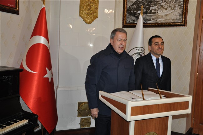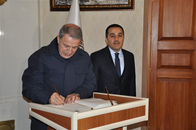 Kars Valisi Türker Öksüz tarafından Valilik girişinde karşılanan Milli Savunma Bakanı Hulusi Akar, Valilik Şeref Defterini imzaladı.