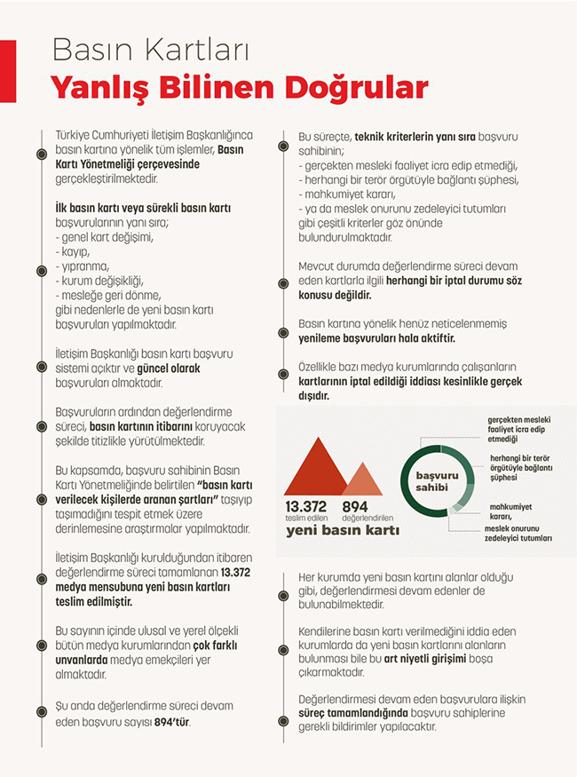 “Son günlerde bazı medya kurumlarında çalışanların basın kartlarının iptal edildiğine yönelik iddialar gerçeği yansıtmamaktadır.