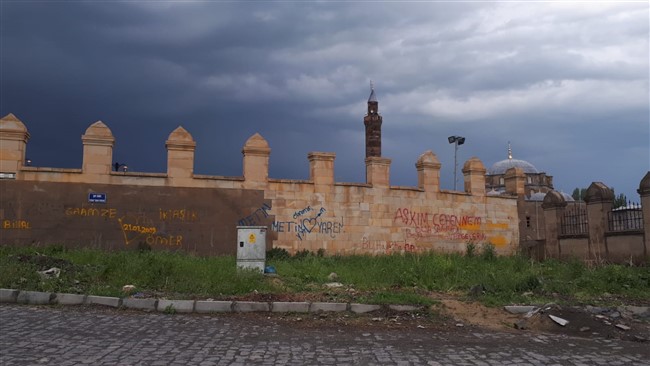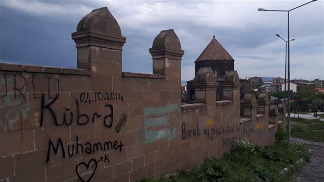 Kars’ın turizm varlıklarının kalbi olan Evliya Camisi ve Ebul Hasan Harakani Külliyesinin çevresini kaplayan beyaz duvarlar üzerine kaba bir şekilde aşkını, nefretini ve ihanetini yazan kendini bilmezler, bu duvarlara ‘Kudüs İslamındır’ diye yazarak, Kudüs’ün, İsrail’den bu kutsal mekânın duvarına yazı yazarak kurtarması, yazıyı okuyanlar tarafından hayretle karşılanıyor.