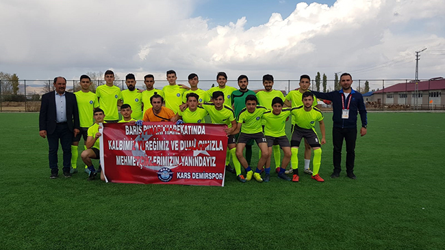 Kars’ta oynanan Kars Demirspor ile Selim Gençlikspor Amatör Lig karşılaşması öncesi futbolcular Barış Pınarı Harekatı'na katılan Mehmetçiğimize “Barış Pınarı Harekatında Kalbimiz, Yüreğimiz ve Dualarımızla Mehmetçiklerin Yanındayız” pankartı açarak destekte bulundu.