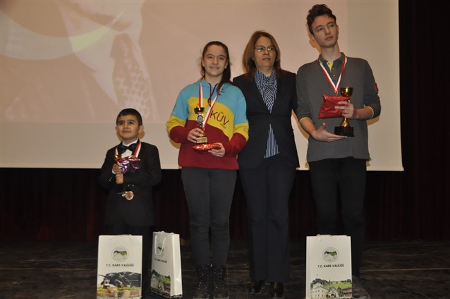 İstiklal Marşı’nı okuma ve Safahat Şiirlerini okuma yarışmasında birinci olan Halit Paşa İlköğretim Okulu Öğrencisi Gülü Nur Ergünyürek’e, Dedekorkut Ortaokulu öğrencisi Derman Ateş ve Kars Fen Lisesi Öğrencisi Meryem Aydın’a ödülleri, Vali Yardımcısı Serdar Demirhan tarafından verildi.