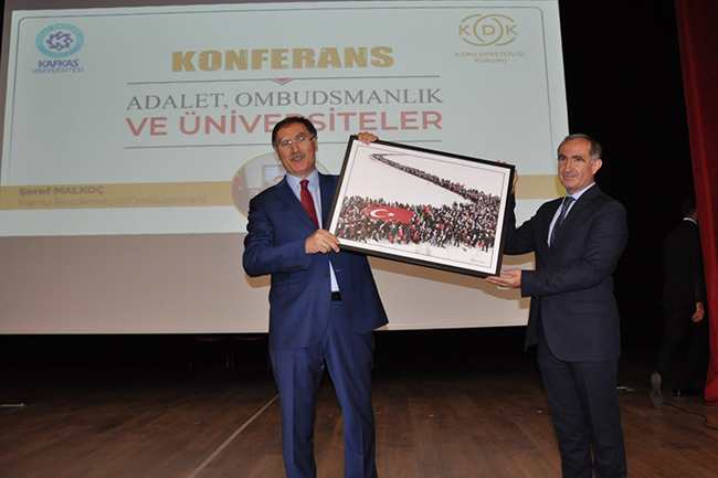 Birtakım ziyaretlerde bulunmak üzere Kars’a gelen Kamu Başdenetçisi Şeref Malkoç, Kafkas Üniversitesi Rektörlüğünce düzenlenen “Adalet, Ombudsmanlık ve Üniversiteler” konulu konferansa katıldı. Kafkas Üniversitesi Ahmet Arslan Kongre ve Kültür Merkezi’nde düzenlenen konferans, saygı duruşu ve İstiklal Marşı’nın okunmasıyla başladı. Konferansın açılış konuşmasını Rektör Prof. Dr. Hüsnü Kapu yaptı. Kars Valisi Türker Öksüz’ün de bir konuşma yaptığı konferansa öğrenciler yoğun ilgi gösterdi.