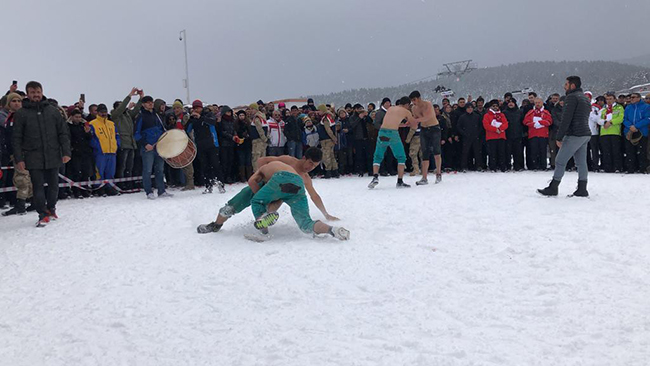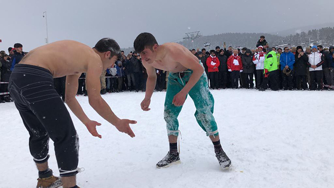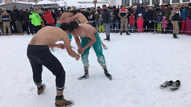 Kars'ta 5. Sarıkamış Kış Oyunları Festivali kapsamında Cıbıltepe Kayak Merkezi'nde düzenlenen karakucak güreşleri nefes kesti.