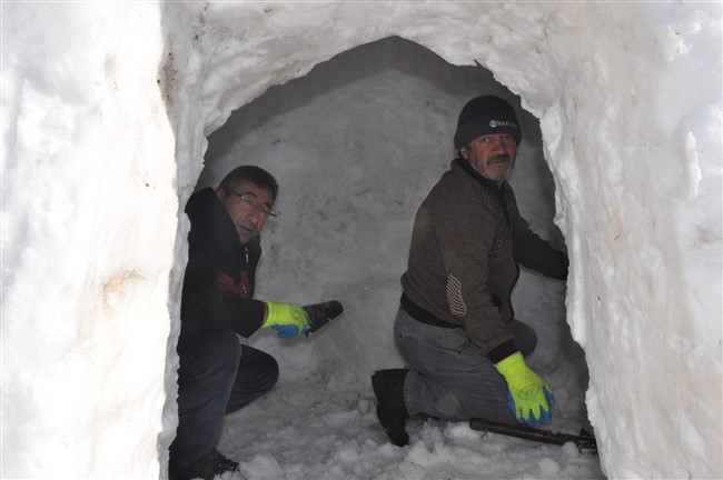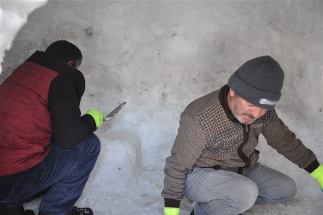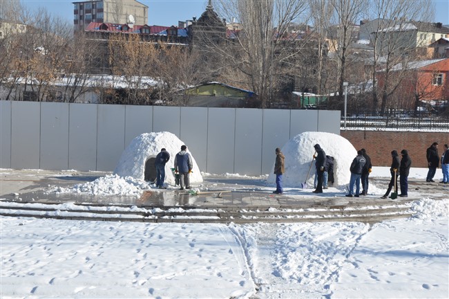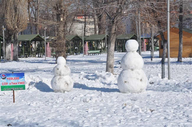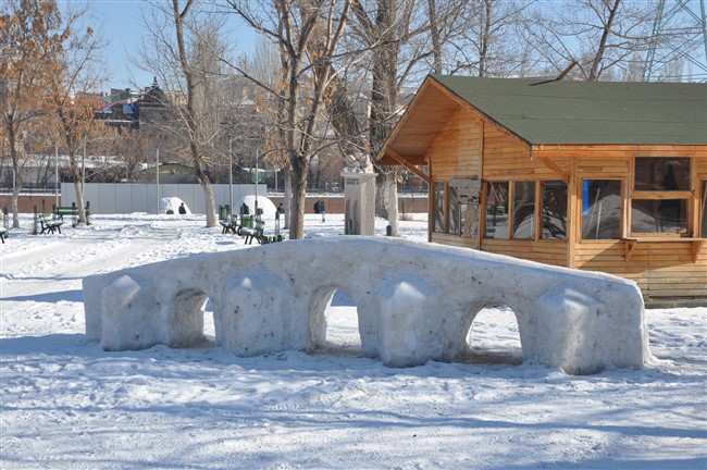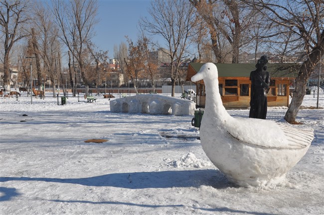 Kars Belediye Başkanlığı da karne alacak öğrenciler için Masal Parkında kardan heykeller yapmaya başladı. Kaz heykeli, köprü, Eskimo evleri ve kardan adam yapıyor.