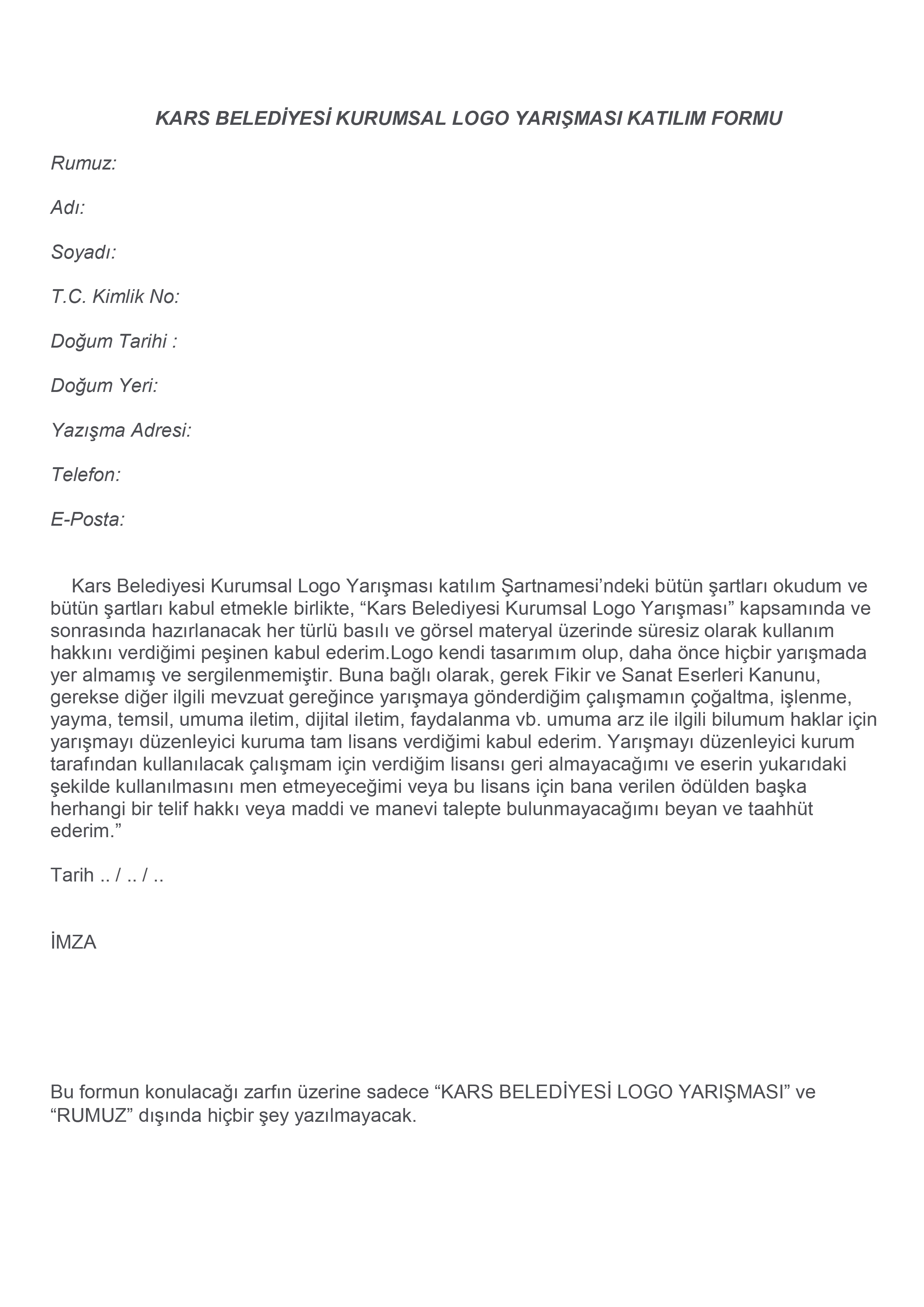k) Gönderilen rumuzlu eserler ve CD’yi içeren zarfın haricinde; isim, soyadı, rumuz, adres, telefon numarası, e-posta adresi ile aşağıda adresi belirtilmiş olan Kars Belediyesi’ne ait web sitesinden indirilerek imzalanacak olan “Kars Belediyesi Kurumsal Logo Yarışması Katılım Formunu” içeren bir kapalı zarfda olmalıdır. Eser/eserlerin ve kimlik bilgilerinin yer aldığı zarflar üzerinde herhangi bir işaret, isim, imge, vs. bulunmamalıdır.