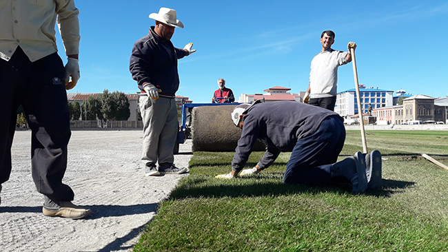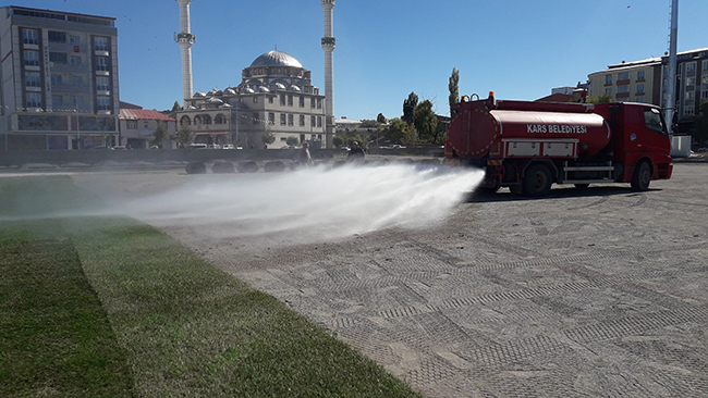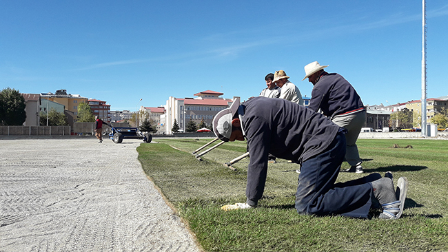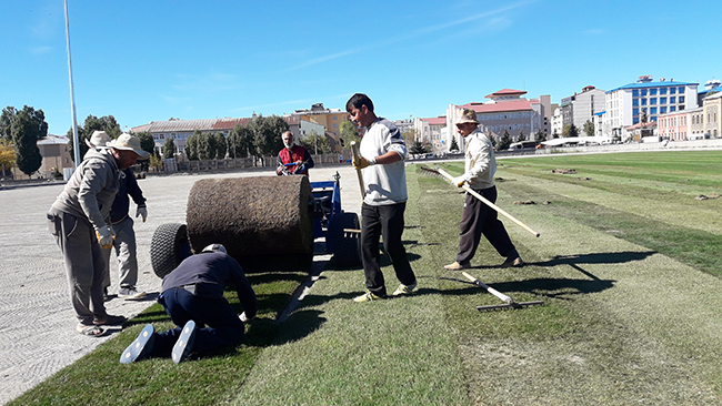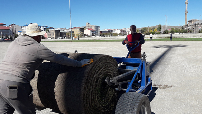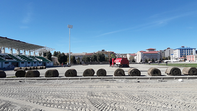 Nisan 2015 tarihinde yıkımı yapılan ve bir türlü yapımı bitirilemeyen Kars Sentetik Yüzeyli Atletizm Pist’nin çimleri seriliyor.
