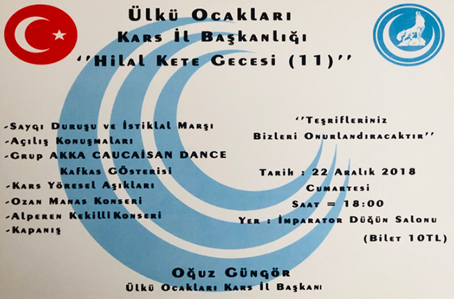 Kars Ülkü Ocaklarının 11. Geleneksel Hilal Kete Gecesi, 22 Aralık Cumartesi Günü Saat: 18.00’de İmparator Düğün Salonu’nda yapılacak.