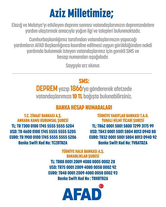 Afet ve Acil Durum Yönetimi Başkanlığı (AFAD), Elazığ ve Malatya’da meydana gelen deprem nedeniyle yardım kampanyası başlatıldığını bildirerek, yardımların AFAD koordinesinde yapılmasının uygun görüldüğü ifade edildi.