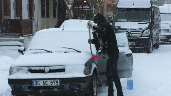 Kars’ta kış hayatı olumsuz etkilemeye devam ediyor. 8 ayı kış olan kentte sabah erken saatlerde işlerine gitmek için dışarı çıkan vatandaşlar sürprizle karşılaştı. Bazı vatandaşlar araçlarının üzerindeki karı temizlerken, bazıları ise iş yerlerinin önününde kar temizliği yaptı.