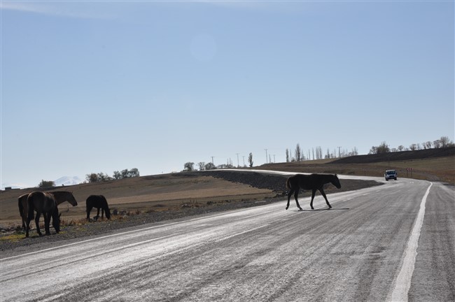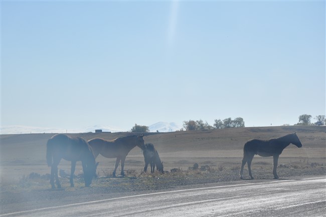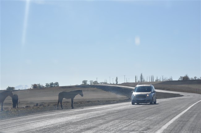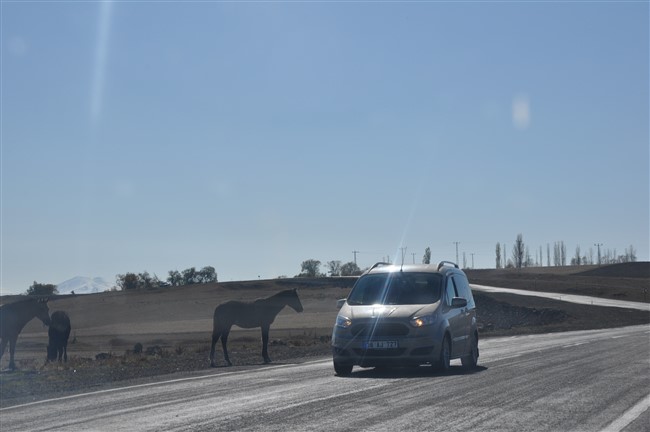 Kars-Arpaçay karayolunda sürüler halinde dolaşan atlar, araçların geçtikleri yollara çıkarak tehlike yaratıyor.