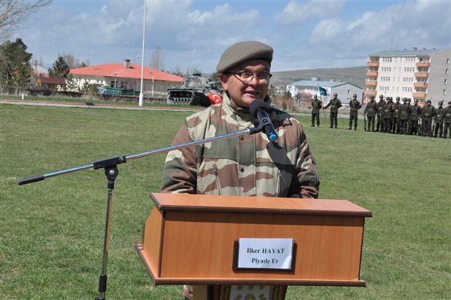 Mehmetçikler adına bir konuşma yapan piyade er İlker Hayat da, “Askerlik kutsal bir görevdir. Bu görev ancak cesaret, fedakarlık, dürüstlük ve mutlak itaatle yerine getirilir. Biz de bu kutsal vatani görevi yapmak üzere 3 hafta önce birliğimize katıldık. Katıldığımız ilk günden itibaren bütün komutanlarımız bizlere “ailen sizleri bizlere vatani görevini yapman için emanet etti, bizlerin tek amacı sizlere askerliği sevdirerek seni bugünkünden daha sağlıklı daha olgun bir şekilde ailene teslim etmektir” diyerek bizleri kendi evlatlarından ayırmadılar. Bugün burada bizden önce vatanın birliğini ve bütünlüğünü korumak için canını seve seve feda eden ecdadımızın kutsal emanetini devralmaktan büyük gurur ve şeref duyuyoruz.” dedi.