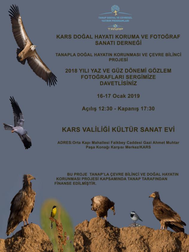 TANAP tarafından finanse eden edilen Kars Doğal Hayatı Koruma ve Fotoğraf Sanatı Derneği tarafından yürütülen “Tanapla Doğal Hayatın Korunması ve Çevre Bilinci” projesi kapsamında 2018 yılı yaz ve güz dönemi kuş gözlem fotoğrafları sergisi açılıyor.