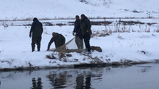 Hava sıcaklığının sıfırın altında 22 derece olduğu Kars’ta, sabah erken saatlerde yüzeyi tamamen donan Kars Çayı'na gelen köylüler, burada imece usulu balık tutarak evlerine balık götürüyor.