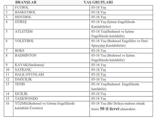 Yaz Spor Okullarında Aşağıda Belirtilen Branşlar Faaliyetler Yapılacaktır.