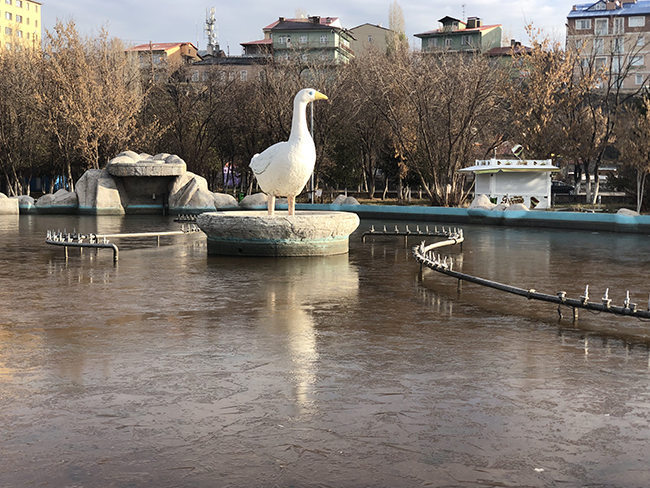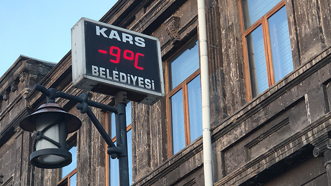 Kars yağışının ardından etkili olan soğuk hava, hayatı olumsuz etkilemeye devam ediyor. Gece hava sıcaklığının sıfırın altına düştüğü kentte sabah erken saatlerde de termometreler eksi 9’u gösterdi. Soğuk havanın etkili olduğu Kars’ta Mesut Yılmaz Parkı'nda bulunan Kaz heykelinin olduğu süs havuzları buz tutarak dondu. Su birikintilerinin buz tuttuğu Kars’ta soğuk havanın önümüzdeki günlerde de etkili olacağı kaydedildi.