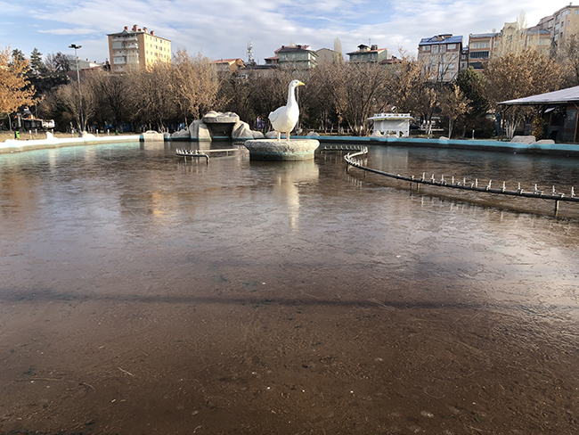 Kars’ta, termometreler eksi 9’u gördü. Kentte bulunan süs havuzları dondu.