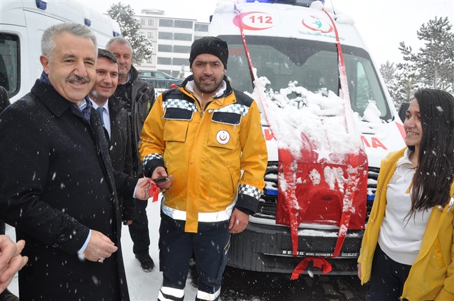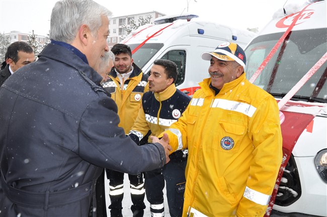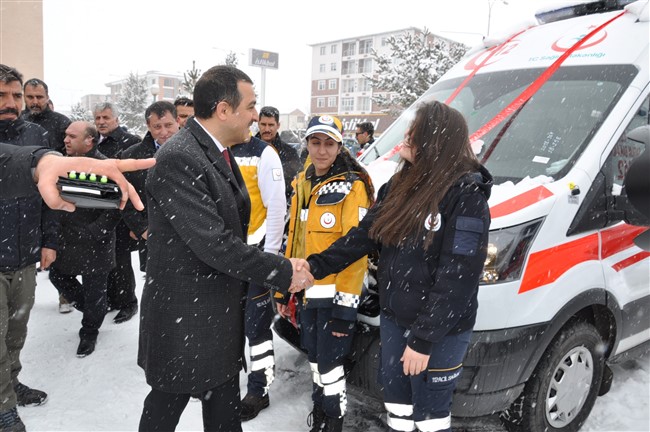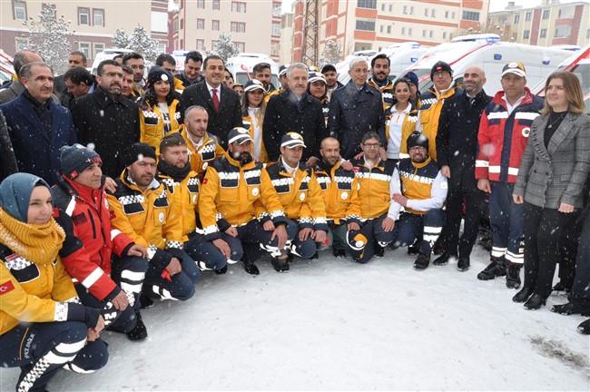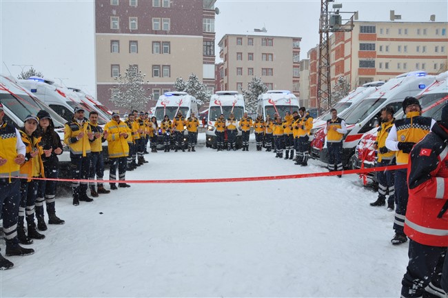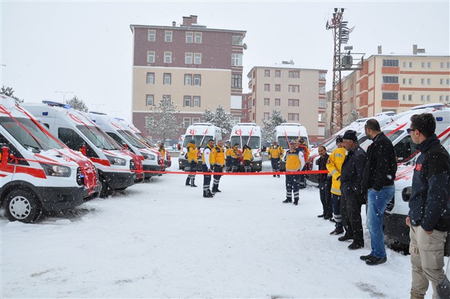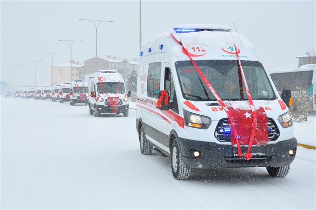 Sağlık Bakanlığınca Kars’a gönderilen tam donanımlı 11 ambulans, kar yağışı altında düzenlenen törenle vatandaşların hizmetine sunuldu.