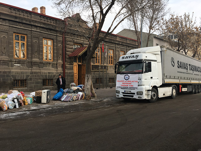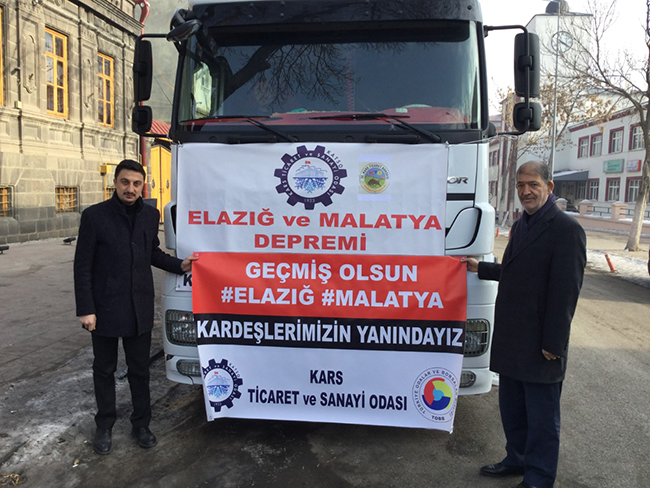 Kars Ticaret ve Sanayi Odası organizasyonu ve Kars Ticaret Borsası katkıları ile Elazığ ve Malatya'daki depremzedeler için toplanan yardımlar, depremzede vatandaşlarımıza ulaştırılmak üzere yola çıktı. Toplanan yardımlar araçlara yüklenerek TOBB ve AFAD eşgüdümünde Elazığ ve Malatya'da depremden zarar gören vatandaşlara ulaştırılacak.