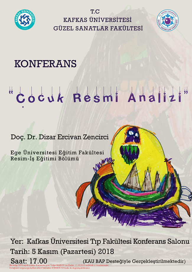 Ege Üniversitesi Eğitim Fakültesi Resim-İş Eğitimi Bölümü’nden Doç. Dr. Dizar Ercivan Zencirci’nin katılacağı “Çocuk Resmi Analizi” konferansı Kafkas Üniversitesi Tıp Fakültesi Konferans Salonunda 5 Kasım Pazartesi günü saat 17.00’de yapılacak.