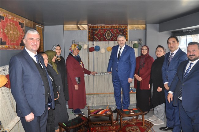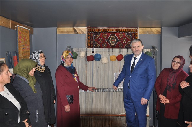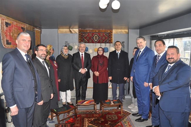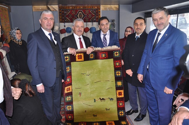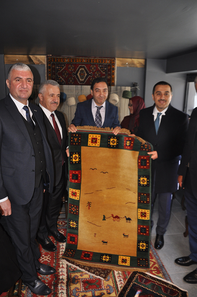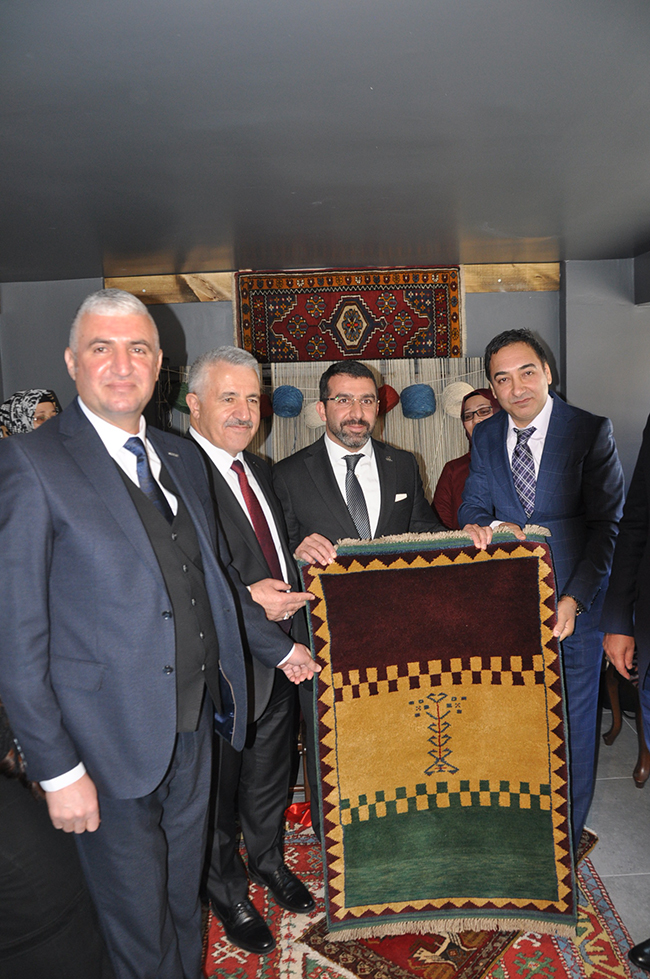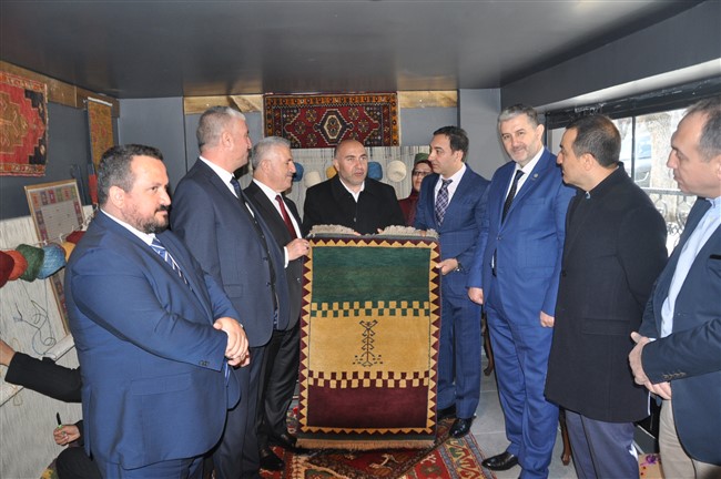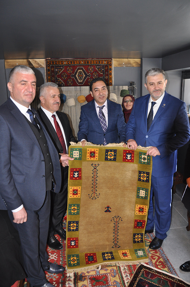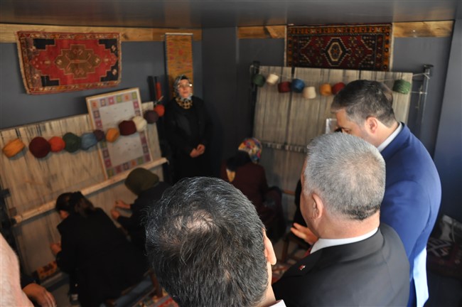 Açılışın ardından el dokuması halı atölyesini gezen Kaan ve Arslan, işletme sahibi Bayram Ali Uçum’dan bilgi aldı.