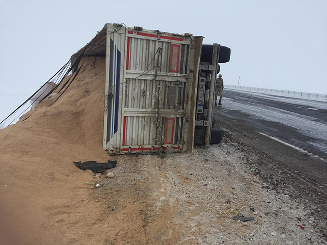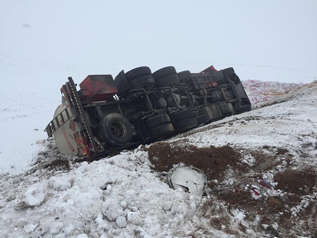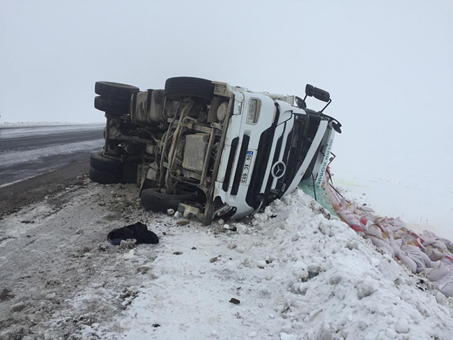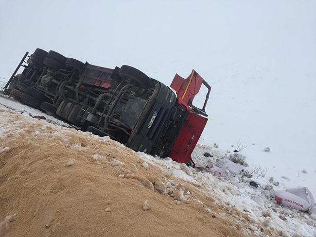 Bozat köyü mevkisindeki bir başka kazada ise M.Ç. idaresindeki 04 AC 603 plakalı kamyon yoldan çıkarak karla kaplı tarlaya devrildi. Kamyon sürücüsü ile araçtaki A.Ç. yaralandı.