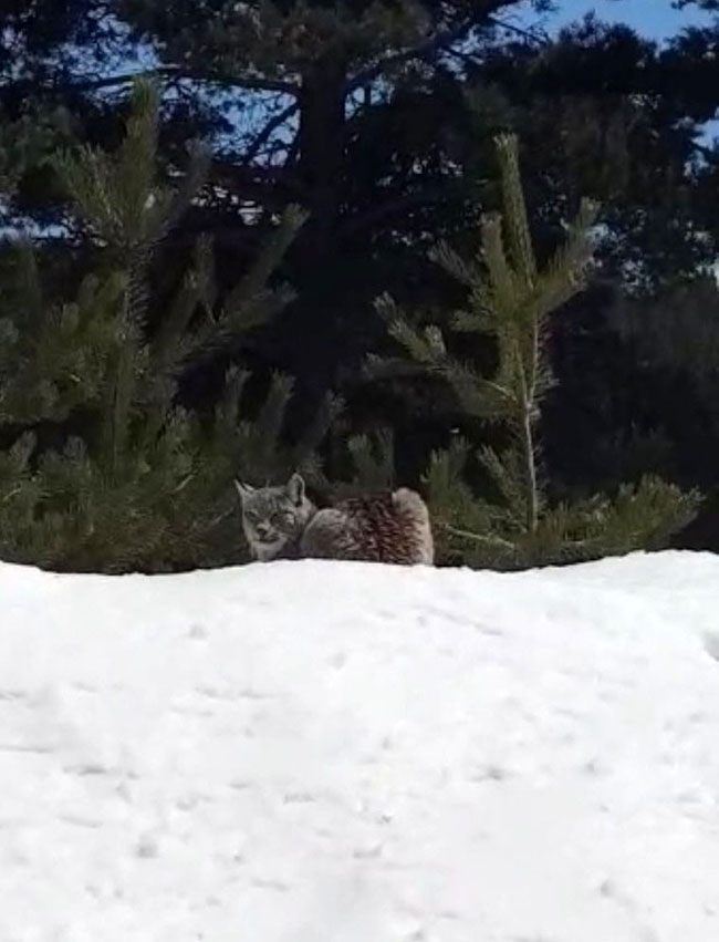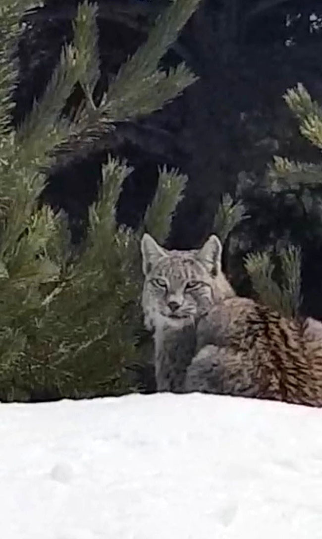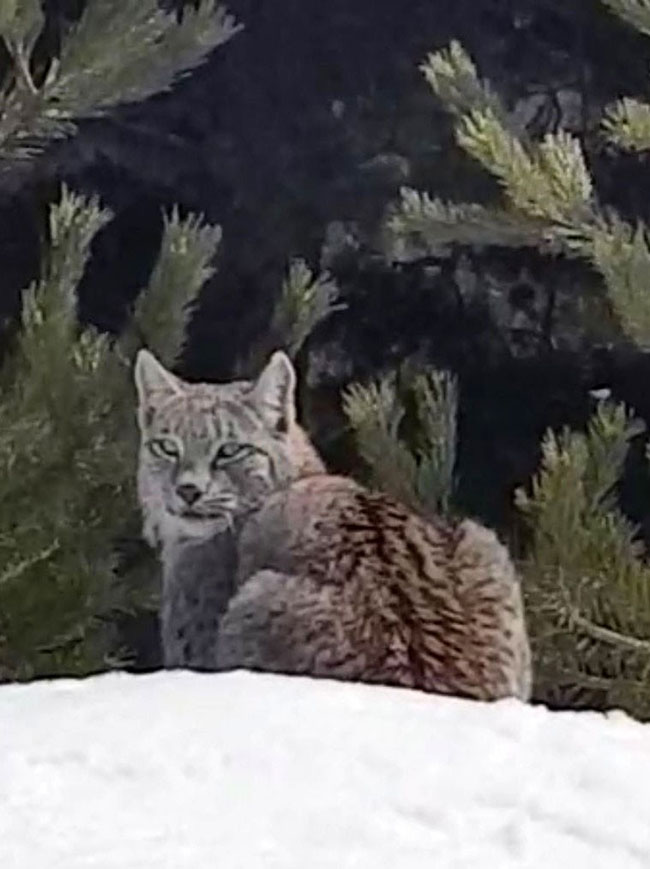 Yaban hayatına ev sahipliği yapan Sarıkamış'ta, çam ağaçları arasında kar üzerinde duran vaşak vatandaşlar tarafından görüntülendi.