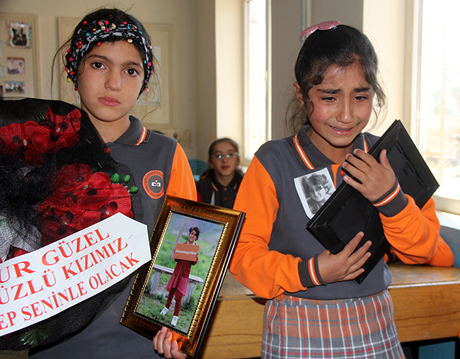 "Sedanur Güzel, melek yüzlü kızımız kalbimiz hep seninle olacak" yazısının konulduğu sırada hüzünlü anlar yaşandı. Okuldaki tüm öğrenciler, yakalarına Güzel'in fotoğraflarını taktı.
