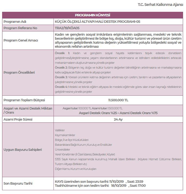 SERKA’dan yapılan açıklamada, “Kamu kurum ve kuruluşları, üniversiteler, mahalli idareler ile 5355 sayılı kanun kapsamındaki mahalli idare birliklerine yönelik ilan edilen Küçük Ölçekli Altyapı Mali Destek Programı-05’in amacı; Kadın ve gençlerin sosyal imkânlara erişimlerinin sağlanması, mesleki ve teknik becerilerinin geliştirilmesi ile bölge kış, doğa, kültür turizmi ve yöresel ürün üretim altyapısının geliştirilerek katma değerin yükseltilmesi yoluyla bölgedeki sosyal ve ekonomik refahın artırılmasıdır. Programın toplam bütçesi 11.500.000 TL’dir. Destek programı için elektronik ortamda (KAYS-Kalkınma Ajansları Yönetim Sistemi) son başvuru tarihi 11 Ekim 2019, saat 23:59, başvurunun e-imza ile imzalanması ya da üretilen taahhütnamenin ıslak imza ile imzalanarak Ajans’a matbu olarak teslim edilmesi için son tarih ise 18 Ekim 2019, saat 17:00’dir” denildi.