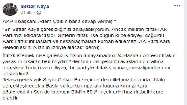 Benim şahsi düşüncem, partilerimiz ittifak yapmasa bile bizler Kars'ta tabanda bu ittifakı gerçekleştirmeye, Kars'ı AKP'nin kıskacından kurtarmaya mecbur değil mahkumuz. AKP'nin Kars merkezde yaklaşık 10 bin, karşısında ise 35 bin oy var. Akp'yi bozguna uğratacak gücümüz var, başaracağız...” şeklinde kullandığı ifadelerine AKP Kars İl Başkanı Adem Çalkın şahsi twitter hesabında “Sn Settar Kaya çaresizliğinizi anlayabiliyorum. Ancak milletin ittifakı AK Partimizi iktidara taşıdı. Sizlerin ittifakı ise bugün ki belediyeyi doğurdu. Karslı artık ihtiraslara ve hesaplaşmalara kurban edilemez. AK Parti Kars Belediyesi’ni Allah’ın izniyle alacak” şeklinde yanıt verdi.