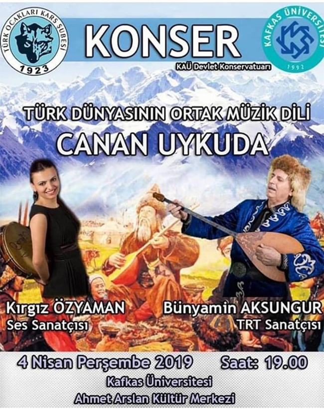 Kars Kafkas Üniversitesi Devlet Konservatuarı ve Kars Türk Ocakları tarafından Ahmet Arslan Kültür Merkezi’nde ortaklaşa konser gerçekleşti. Konser programı 4 Nisan Perşembe günü saat 19.00’da Kars Türk Ocakları Başkanı Doç. Dr. Mithat Durmuş’un konuşmasıyla başladı. Konuşmanın akabinde Kars Kafkas Üniversitesi Kafkas ekibi dans gösterisinde bulundu. Kapanış programını TRT ses sanatçısı Bünyamin Aksungur ve ses sanatçısı kızı Kırgız Özyaman yaptı. ‘Türk Dünyası’nın ortak müzik dili Canan Uykuda’ adlı konser programına katılım yoğundu.