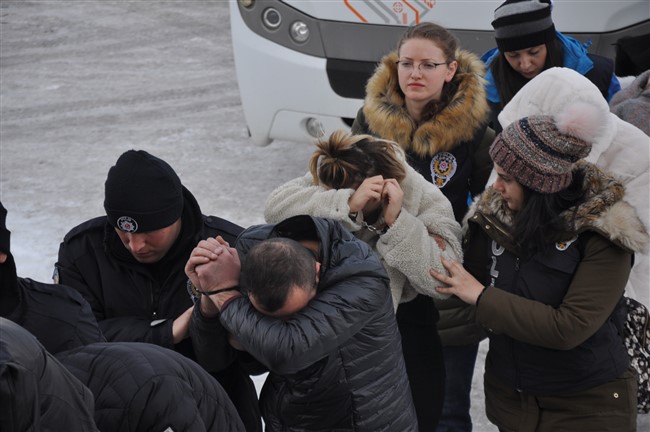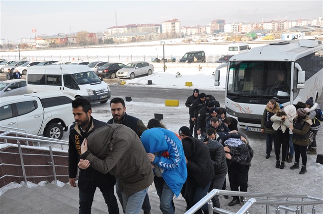 Düzenlenen operasyonda 5 kadın, 14 erkek olmak üzere toplam 19 şahıs “Suç İşlemek Amacıyla Örgüt Kurma (TCK madde 220) ve (TCK madde 158 -1 L,F) Nitelikli Dolandırıcılık” suçu kapsamında gözaltına alınarak Kars Emniyet Müdürlüğüne getirildi.