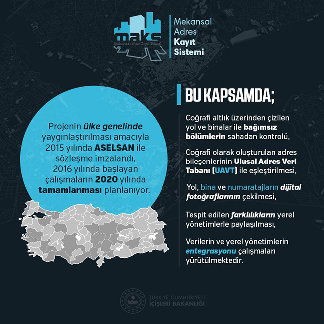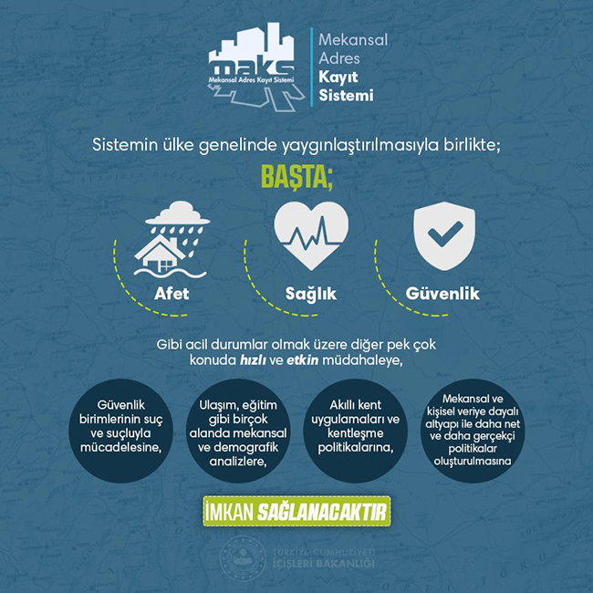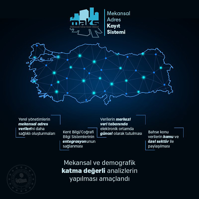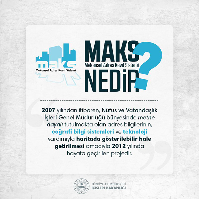 Coğrafi bilgi teknolojileri kullanılarak adres bilgilerine mekânsal boyut kazandırdığı, mekansal adres verilerinin kamu ve özel sektör ile paylaşıldığı, yerel yönetimlerin coğrafi adres verisi üreten konuma getirilerek dijital dönüşümlerin sağlandığı, büyük verilerin işlendiği, saklandığı ve oluşan büyük verilerin entegrasyonunun sağlandığı, mekânsal ve demografik katma değerli analizlerin yapılabildiği MAKS, Türkiye’nin en büyük dijital dönüşüm projesi.