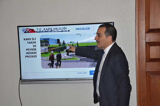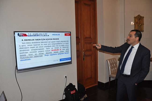 Vali Türker Öksüz, konuşmasının devamında ise 2020 yılı içerinde hayata geçirilecek 60 projeyi de aşağıdaki şekilde kamuoyunun dikkatine sundu. Vali Türker Öksüz, daha sonra Makine Parkı Projesi, Kavılca Buğdayının Tanıtımı ve Yaygınlaştırılması Projesi, Kars İli Tarım ve Peynir Müzesi Projesi, Droneler Tarım İçin Uçuyor Projesi, Kars İli Tarımsal Üretimin Çeşitlendirilmesi ve Kırsal Turizmin Geliştirilmesi Projesi, Prefabrik Kaz Kesimhanesi Projesi, Tamburlu Sulama Sistemi Projesi, Coğrafi İşaretli Kars Balına Dolum ve Paketleme Ünitesi Konulması Projesi, Kars Bedesteni ve Konakları ile Turizm Alanları Hayat Buluyor Projesi başta olmak üzere yaklaşık 60 proje hakkında slayt gösterisi eşliğinde bilgi vererek projelerin tamamlandığında Kars’ın çehresi değişeceğine dikkat çekti.